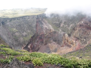 The next day, the weather was reasonable and the forecast quite good, so we decided to climb the volcano. This is a perfectly normal thing to do, and it's only a hiking course, not actual mountain climbing. It's not even particularly strenuous hiking, although it is rather more than just a stroll. You can drive quite a long way up, and then park at a point with shops and a police point. I suspect that the main job of the policeman is evacuating tourists on the volcano if it decides to erupt; there is a metalled path running from the car park to the mountain, which I think the car we saw could drive along. There were also a number of concrete shelters dotted around, for hiding in if the volcano got violent. Fortunately, it was well-behaved while we were there. I had to explain to Yuriko that actually, for well-monitored volcanoes, particularly of this kind, scientists can predict eruptions a few days in advance, so there wasn't really anything to worry about. It was reassuring to see all the monitoring equipment in place, however.