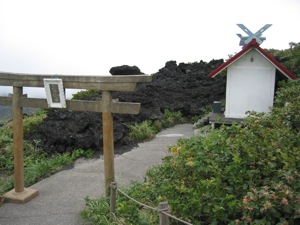 Mihara Shrine, with the lava flow behind it. The shrine was there first.