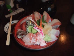 神社から旅館に戻った。真由喜がまた起きたが、歩こうとしなかったので抱っこになった。ゆり子が九谷焼の店によって、お土産を買ったが、三人とも疲れていた。旅館のすみよしやは、金沢の近江町市場の隣だから、市場の中にあるレストランで晩ご飯をした。名物は海鮮丼だから、二人ともそれを注文した。私が能登の海鮮丼にしたが、ゆり子が特選海鮮丼を選んだ。やはり美味しかった。どんぶりに刺身だったが、刺身は大きくて新鮮で、普通の刺身より美味だった。